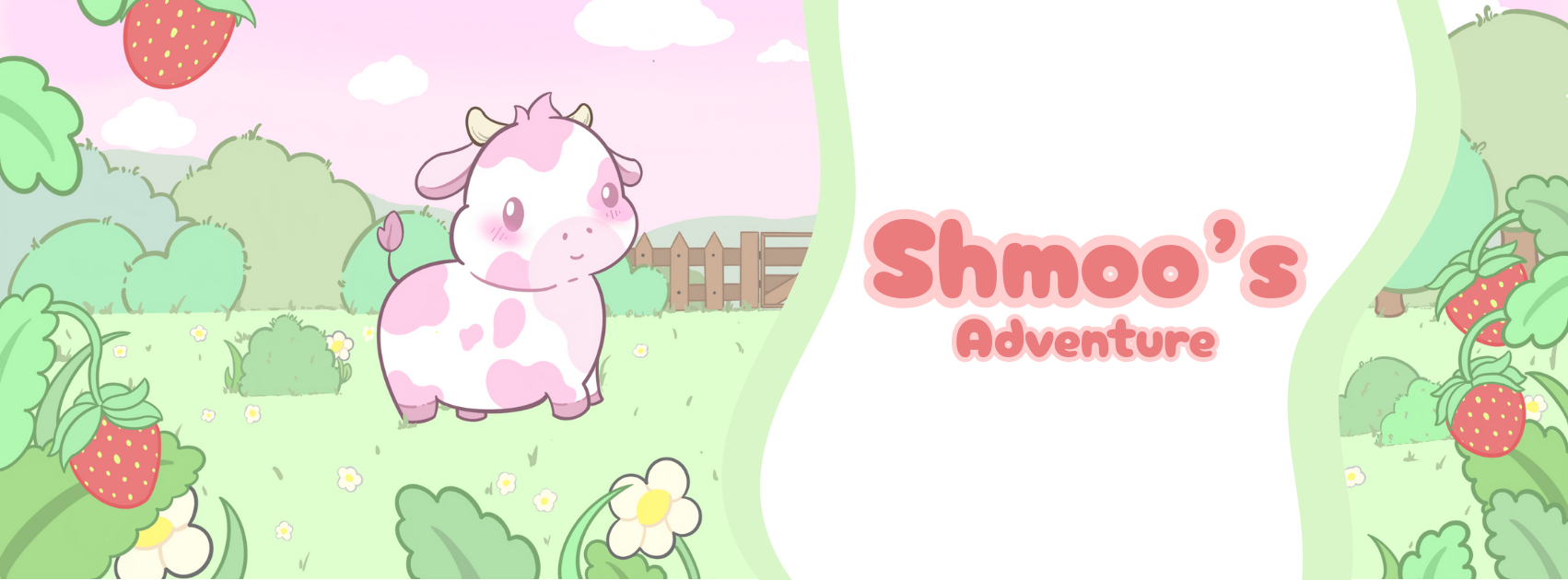 Shmoo's on an adventure. Traveling across lush green fields full of strawberry's under a soft pink sky